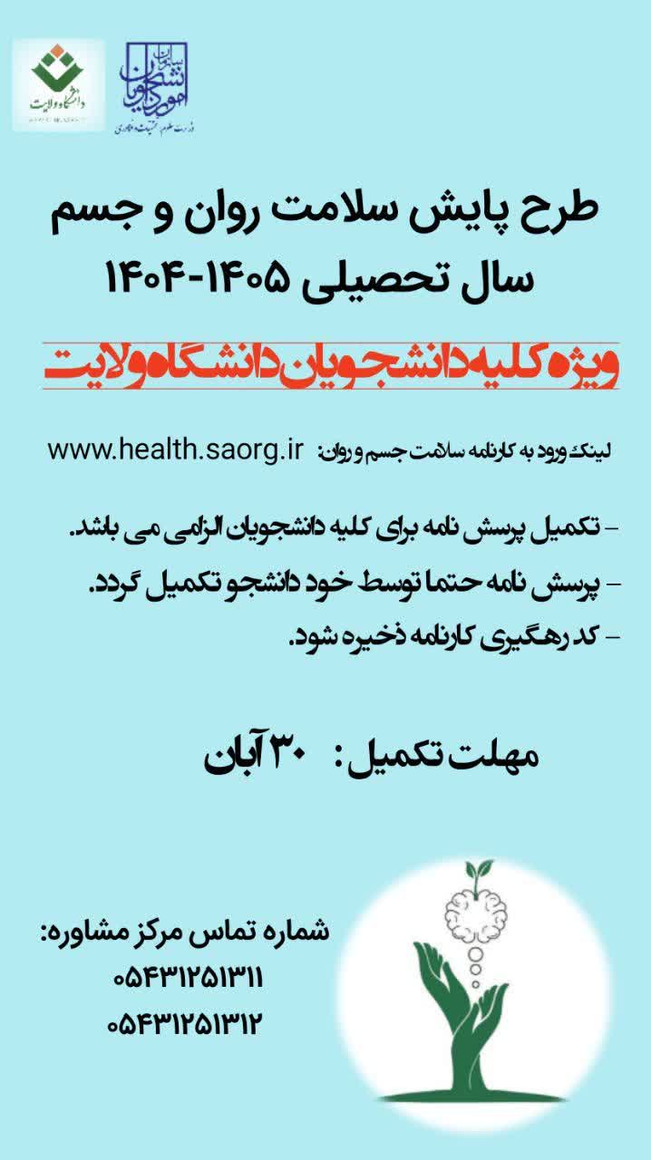 مرکز مشاوره و سبک زندگی دانشگاه ولایت ضمن عرض تبریک آغاز سال تحصیلی جدید و خیر مقدم به دانشجویان گرامی،به اطلاع می رساند،طرح پایش سلامت جسم و روان در ابتدای سال تحصیلی در راستای ارزیابی جامع سلامت دانشجویان برگزار می گردد.